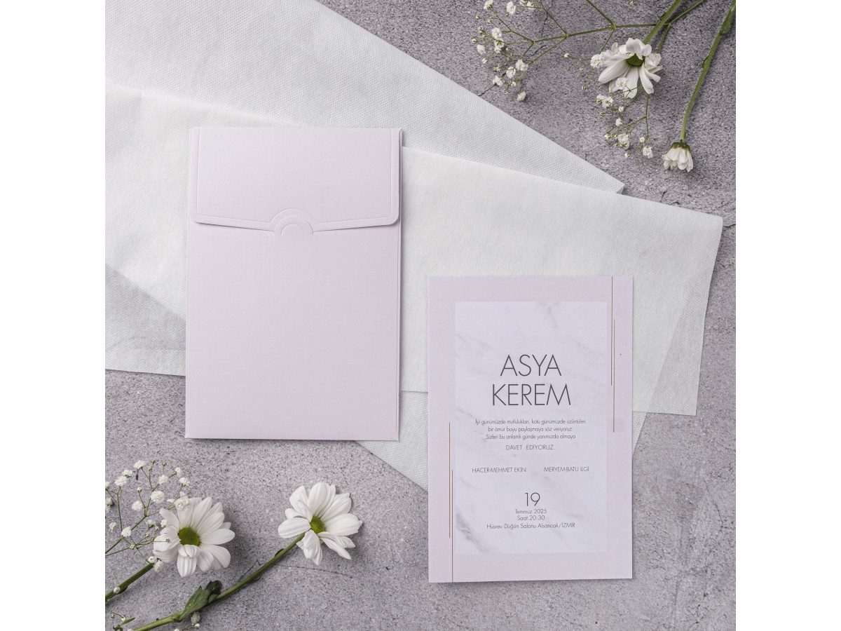 • Davetiyenin ekran görüntüsü ile davetiyenin orijinali arasında renk tonlarında ufak tefek farklılıklar olabilir, bu durum hatalı olarak kabul edilmez. Kullandığınız cihazın ekran kalibrasyonu ile ilgili bir durumdur. Kağıtlardan kaynaklanan desen ve ton farklılıklarından dolayı firmamız sorumlu değildir.