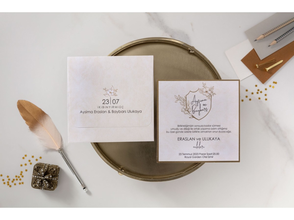 Davetiyenin zarfına gelin ve damat isimleri ve düğün tarihi ofset baskı uygulanmıştır. Zarfı ve iç kısmı açık renklerde tasarlanmış sade kare davetiye.