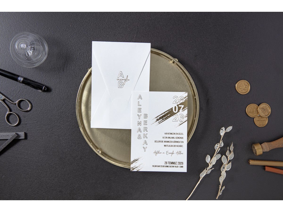 Zarfın üzerine gelin ve damat isimlerinin baş harfleri altın yaldız baskı uygulanmıştır. İç kısmı altın yaldız baskılı olarak tasarlanmış sade şık davetiye.
