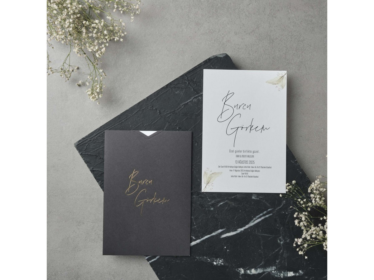 Siyah zarfın üzerine gelin ve damat isimleri altın yaldız baskı uygulanmıştır. İç kısmı çiçek detaylı sade davetiye.