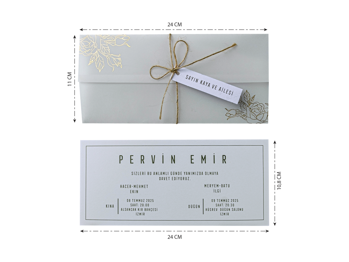 Transparan zarflı üzerinde yaldız çiçek motifleri ve ipli isimlik aksesuarı vardır. İç kısmı ise sade olarak tasarlanmıştır.