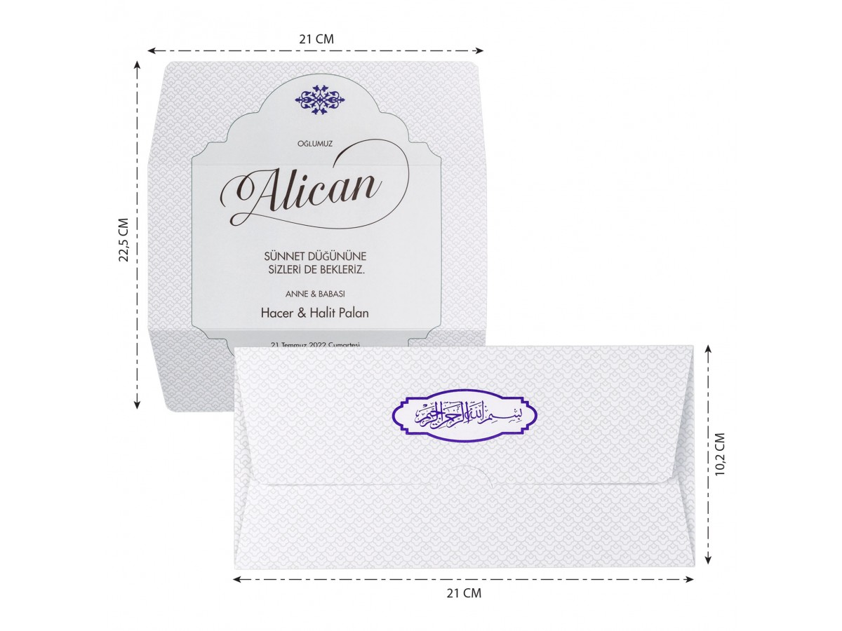 Davetiye zarfsız olarak tasarlanmıştır ve katlandığında zarf şeklini almaktadır. Besmele detaylı ekonomik sünnet davetiyesi.