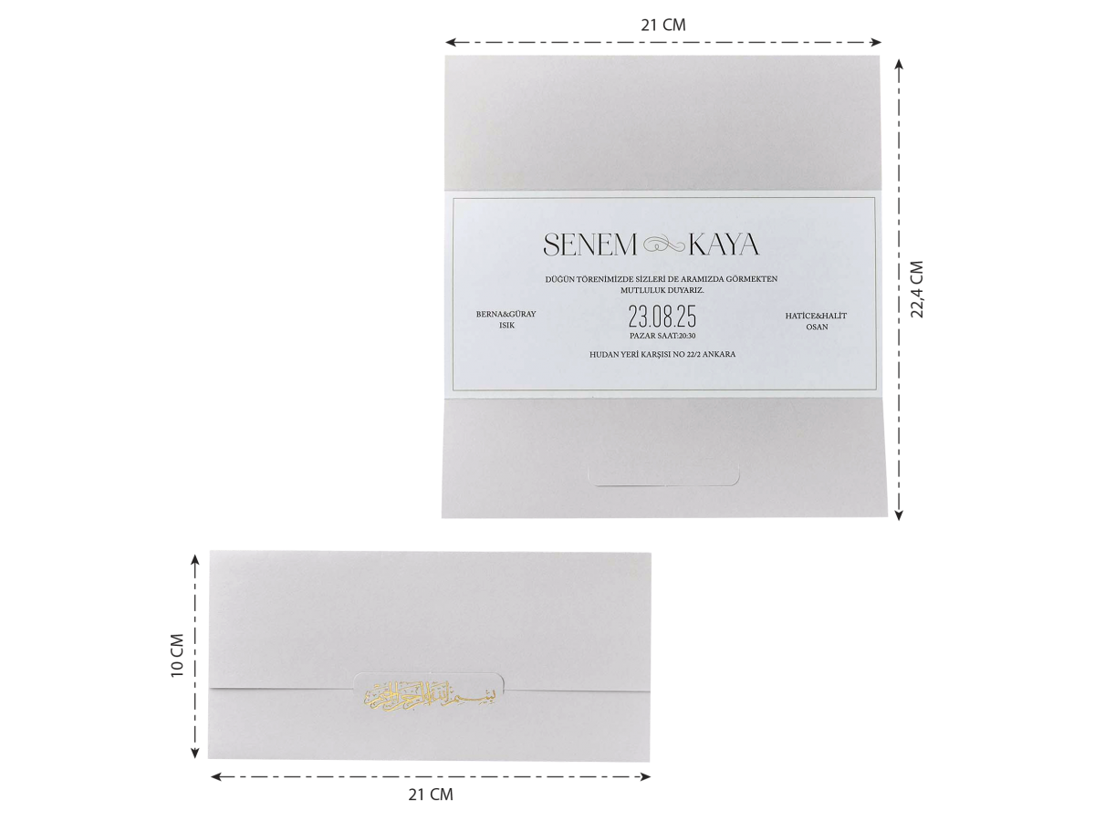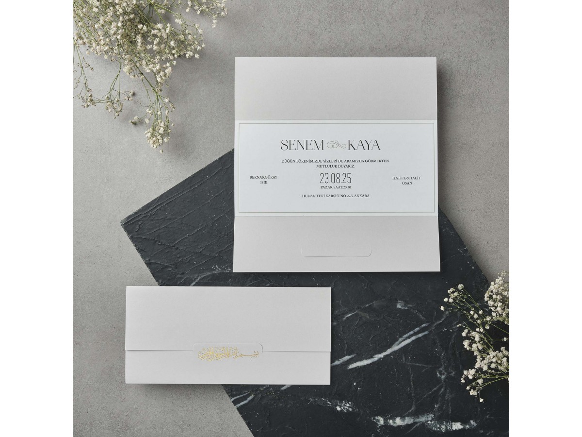 • Davetiye zarfsız tek parça katlamalı olarak tasarlanmıştır. Ön kısma altın yaldız besmele işlemesi uygulanmıştır.