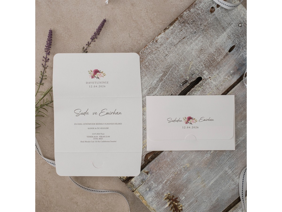 Davetiye zarfsız model tek parça olarak tasarlanmıştır. İç ve kapak kısmı takım olarak tasarlanmıştır. Kapak kısmında gelin ve damat isimleri ile tarih ofset baskı uygulanmıştır.