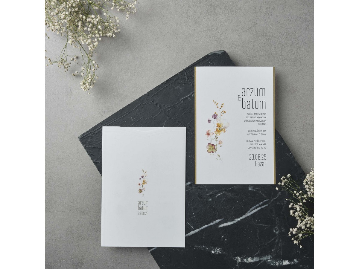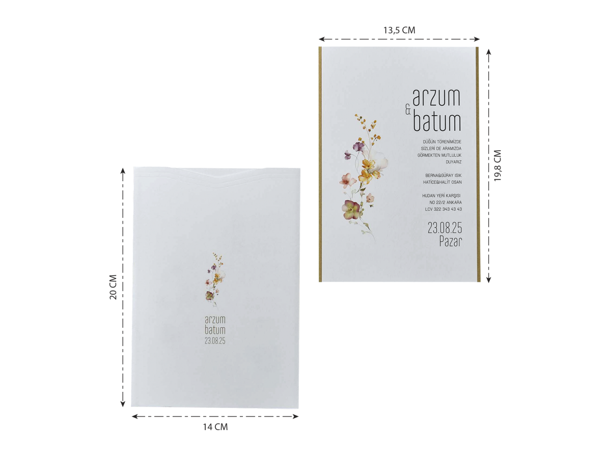 Çiçek detaylı zarfın üzerine gelin ve damat isimleri ofset baskı olarak uygulanmıştır. İç kısmı çiçek detaylı sade olarak tasarlanmıştır.