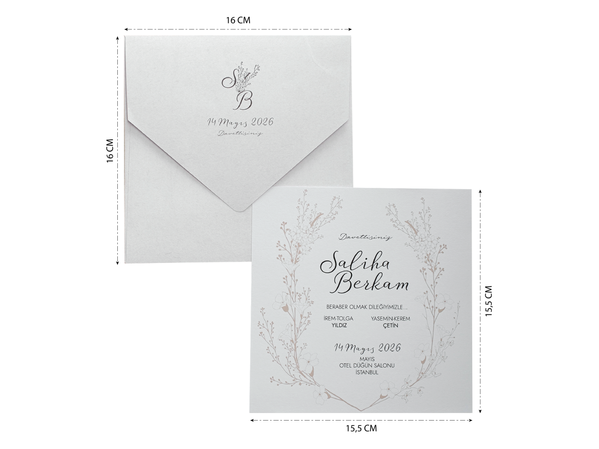 • Zarfın üzerine gelin ve damat isimlerinin baş harfleri ofset baskı uygulanmıştır. İç kısmı çiçek monogramlı sade davetiye.