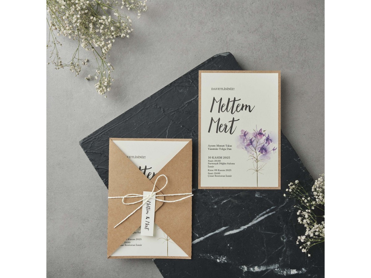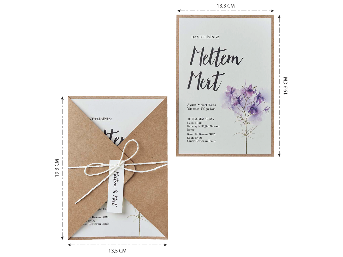 Davetiyenin zarfı kraft kartondan yapılmıştır. İç kısmı çiçek desenli sade olarak tasarlanmıştır. Aksesuar olarak ip ve isimlik vardır.