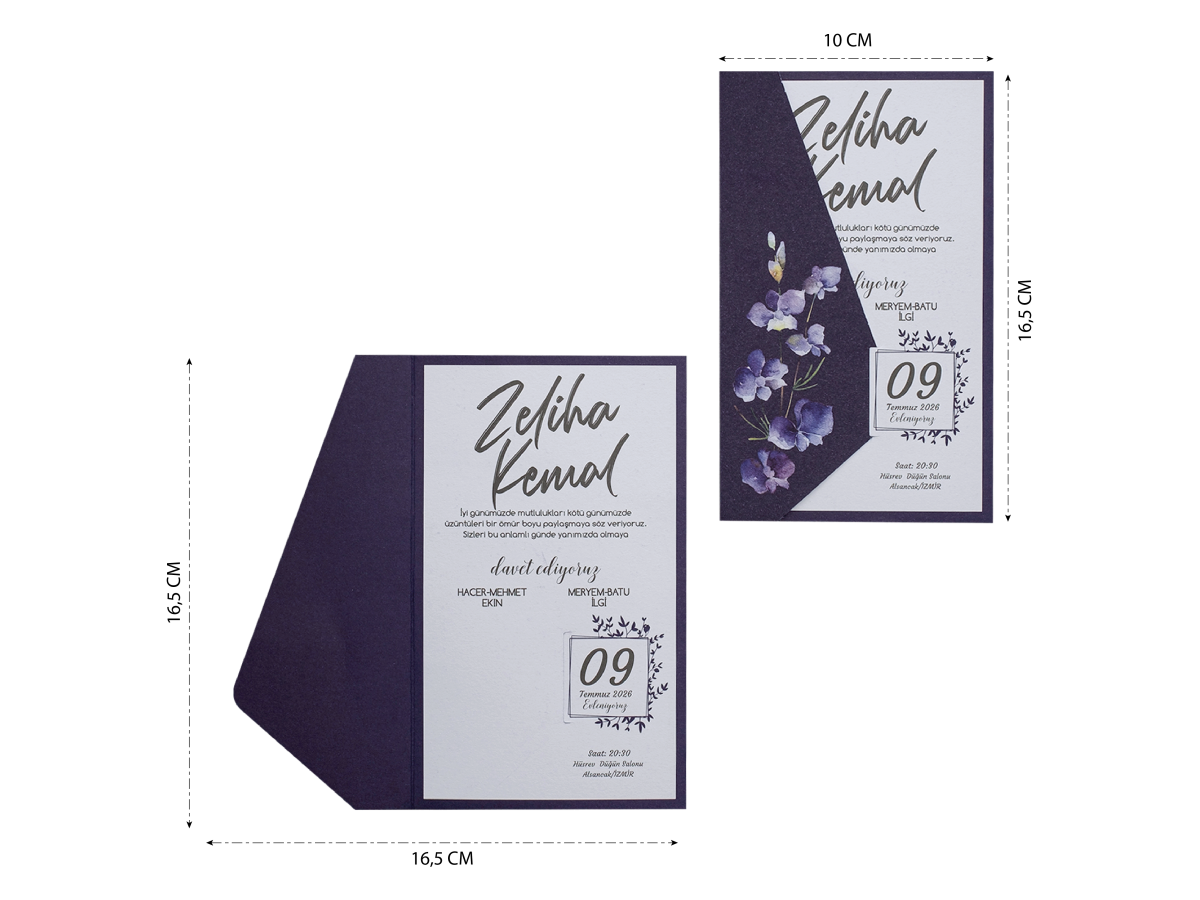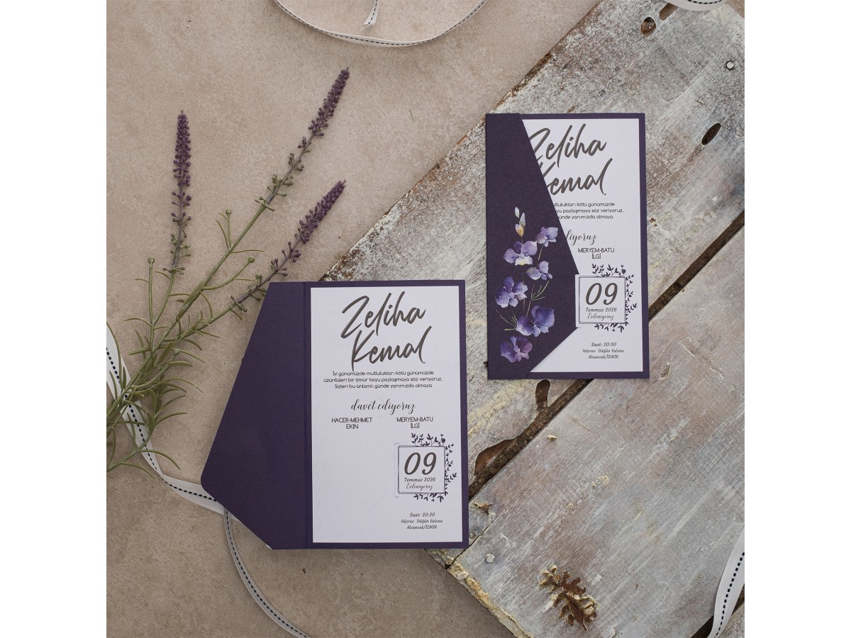 • Zarfsız katlamalı tek parça halinde tasarlanmış mor renk davetiyemiz.