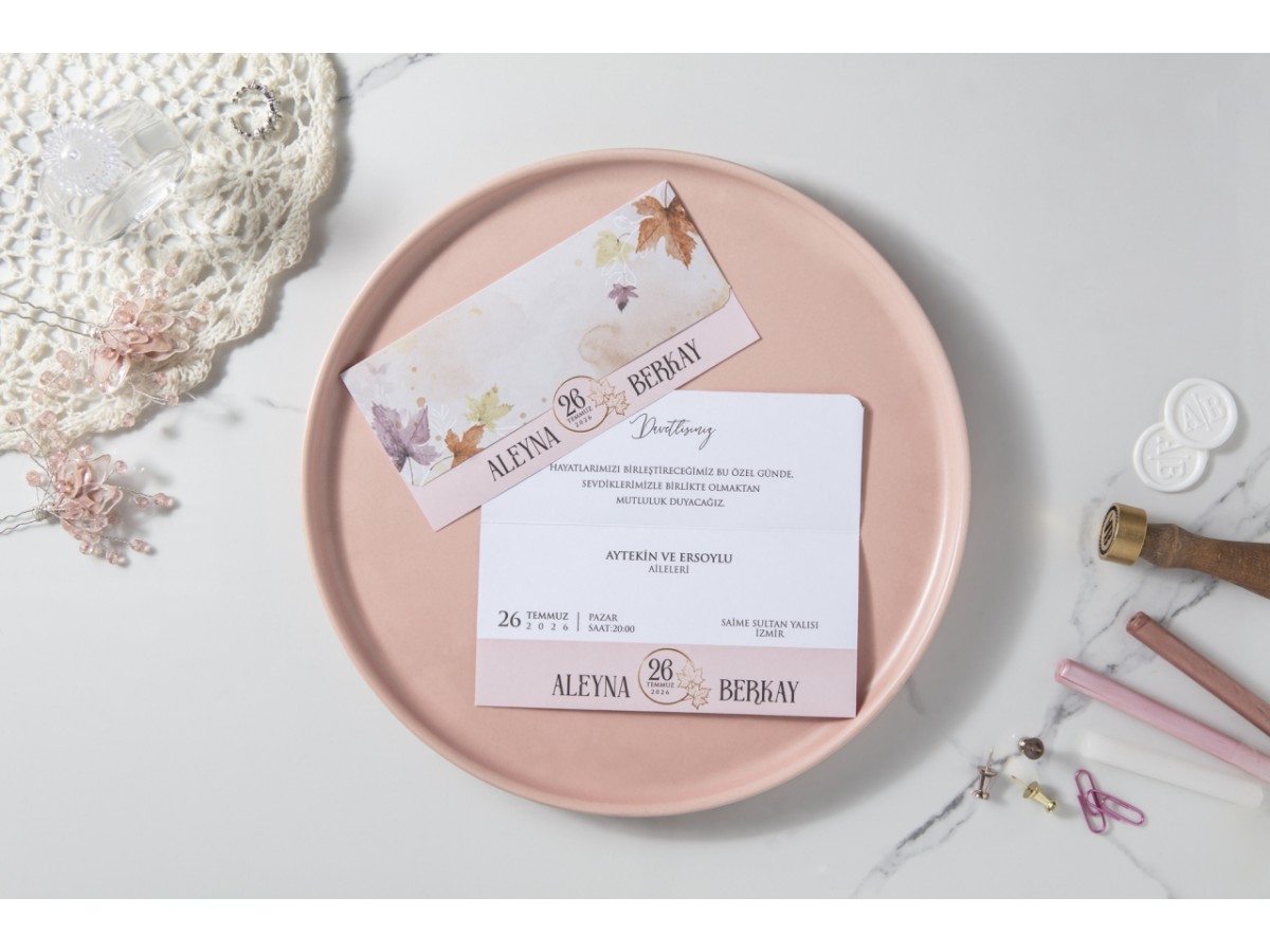 Davetiye zarfsız olarak tasarlanmıştır. Çınar yaprak detaylı üst kısımdan katlamalı ekonomik davetiye.