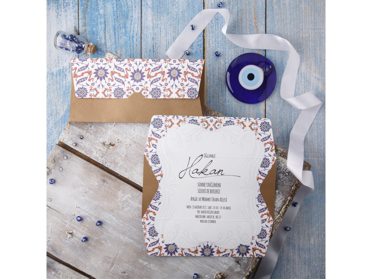 Davetiye zarfsız olarak tasarlanmıştır katlandığında zarf şeklini almaktadır. Çiçek motifli ekonomik sünnet davetiyesi.