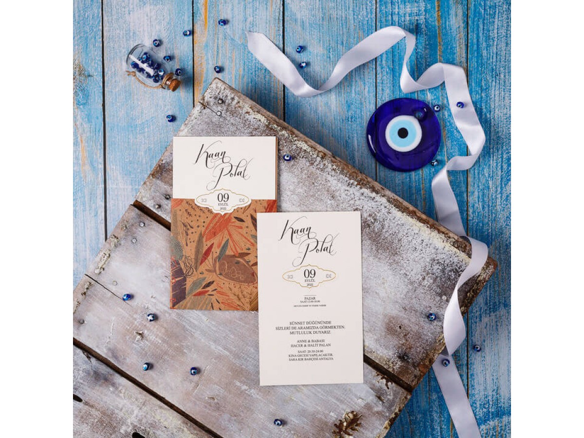 Davetiyenin zarfı kraft üzerinde renkli desenler vardır. İç kısmı krem rengi tonlarında altın yaldız detaylı sade olarak tasarlanmıştır.