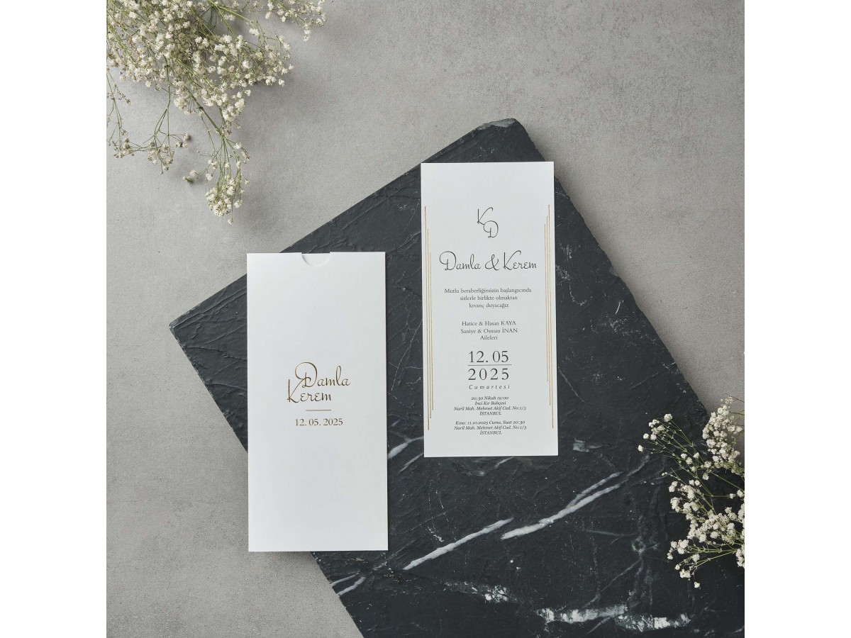 • Zarfın üzerine gelin ve damat isimleri altın yaldız baskı uygulanmıştır. İç kısmı sade modern olarak tasarlanmıştır.