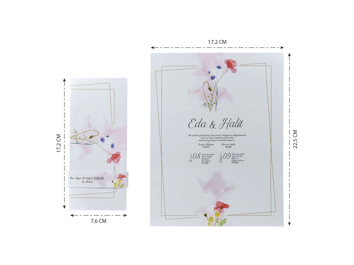 Davetiyenin boyutları son resimde belirtilmiştir.