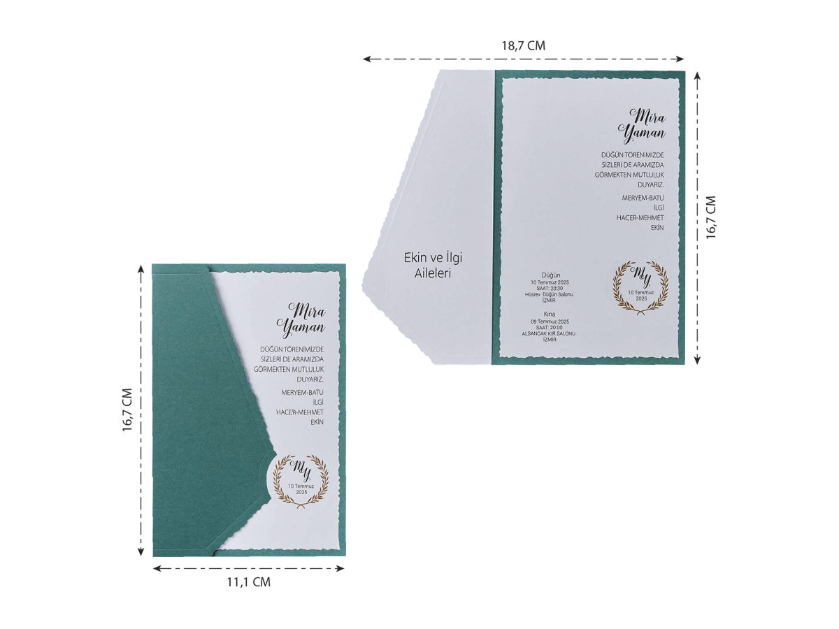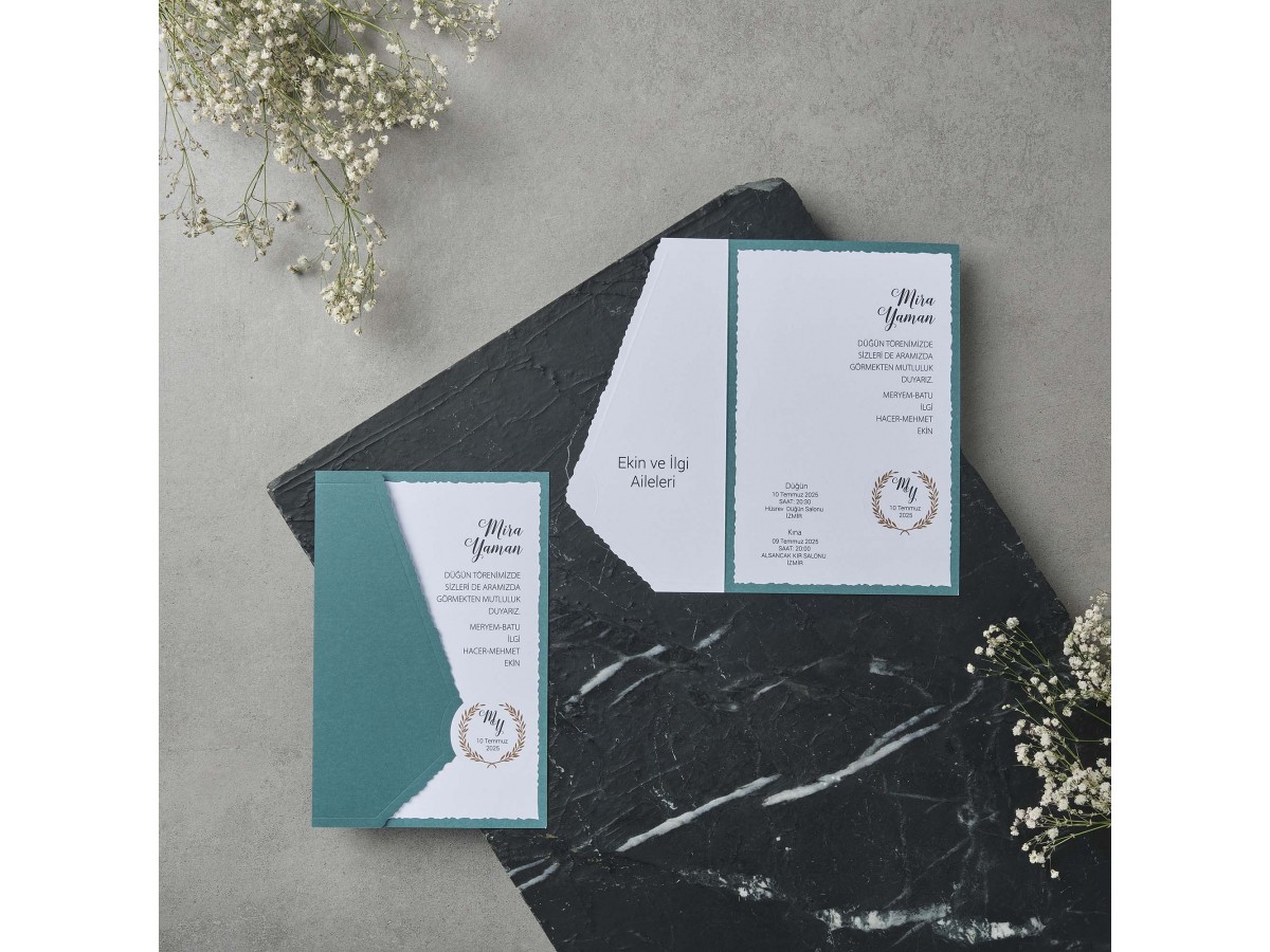 Davetiye zarfsız tek parça katlamalı olarak tasarlanmıştır. Üzerinde ofset baskı monogram detaylı ekonomik yeşil düğün davetiyesi.