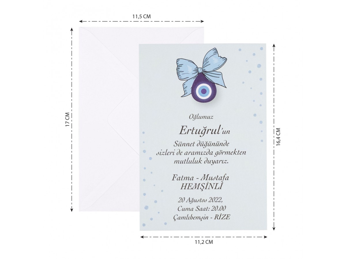 Davetiyenin standart beyaz renk zarfı mevcuttur. İç kısmı açık mavi tonlarında nazar boncuk detaylı ekonomik sünnet davetiyesi.