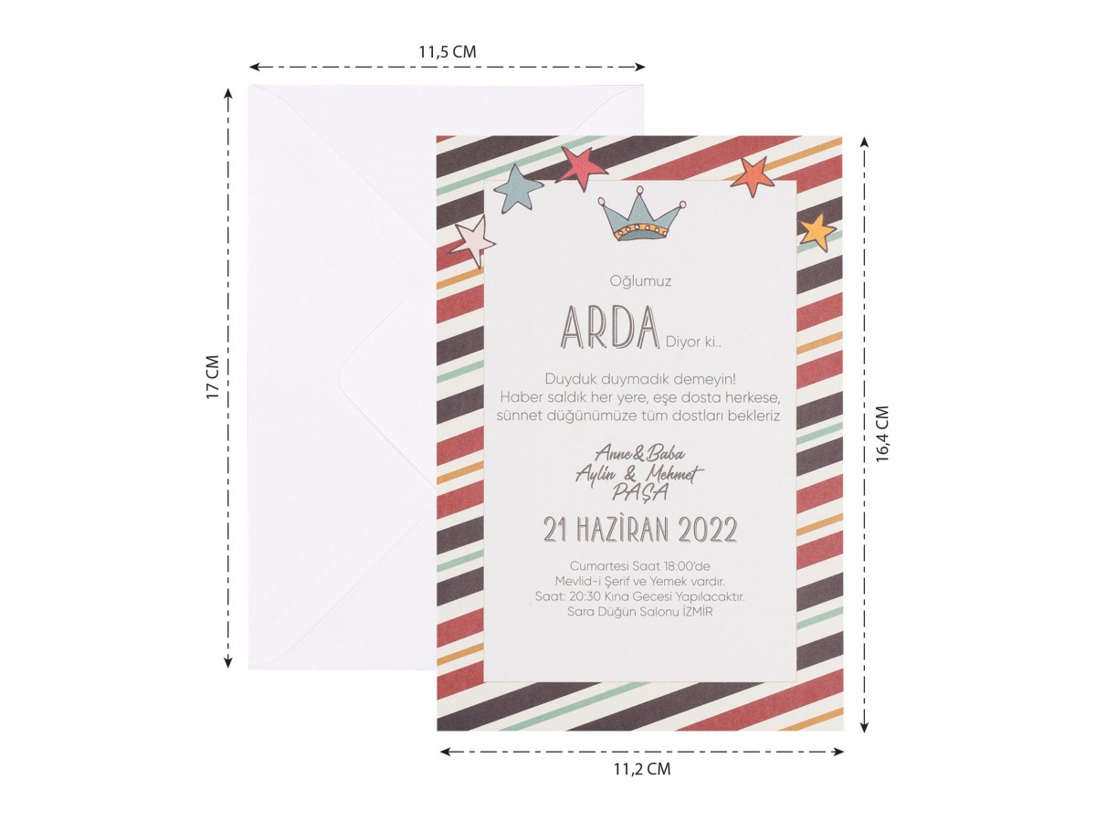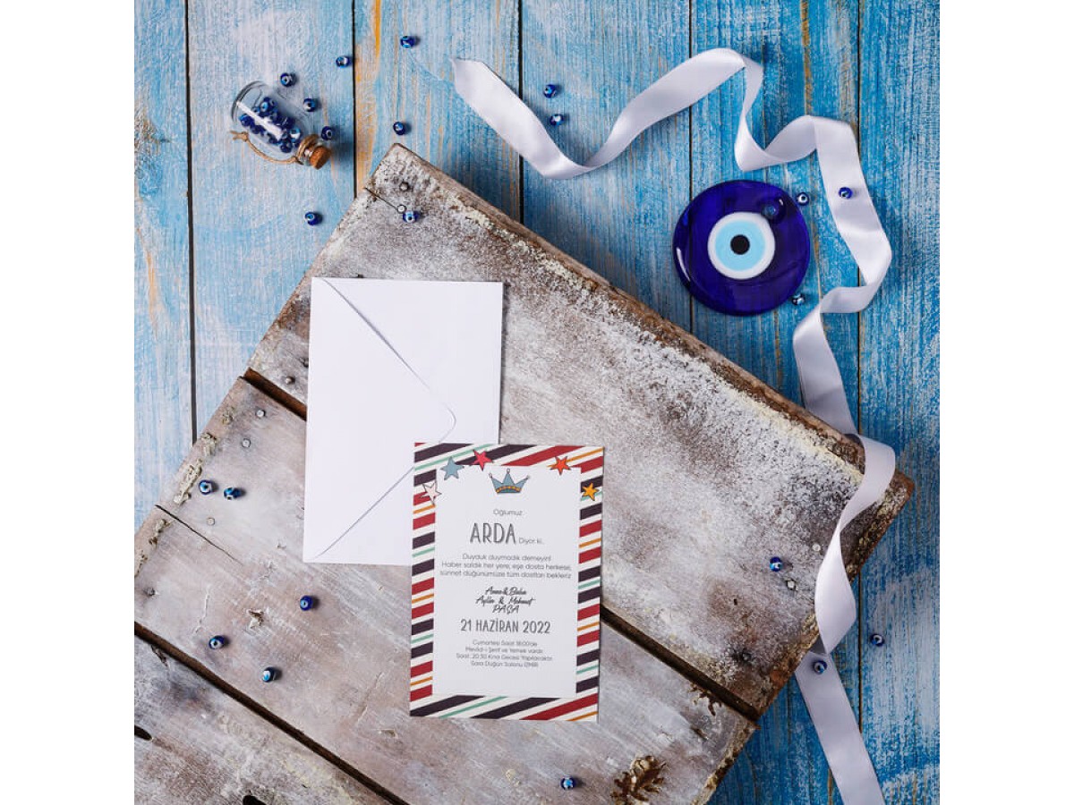 Davetiyenin standart beyaz renk zarfı vardır. İç kısmı renkli taç detaylı ekonomik sünnet davetiyesi.