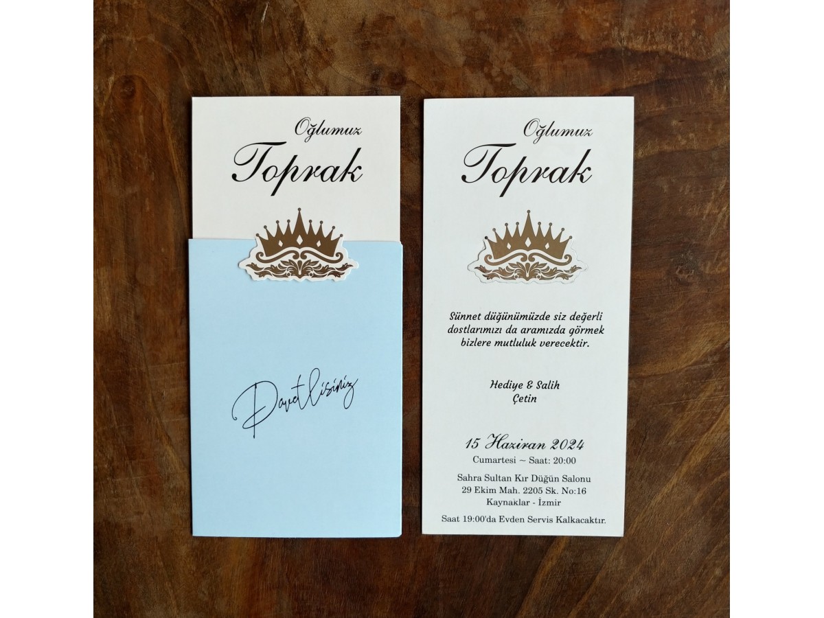 Davetiyenin zarfı açık mavi tonlarında tasarlanmıştır ve üzerine gümüş yaldız davetlisiniz yazısı basılmıştır. İç kısmı açık krem tonlarında üzerinde gümüş yaldız taç vardır.