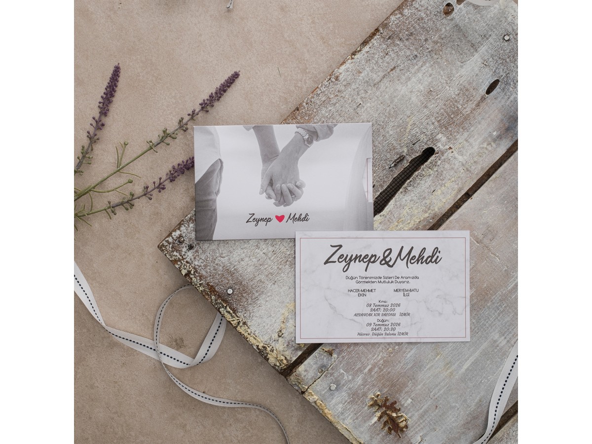 El ele tutuşan çift detaylı ekonomik düğün davetiyesi.
