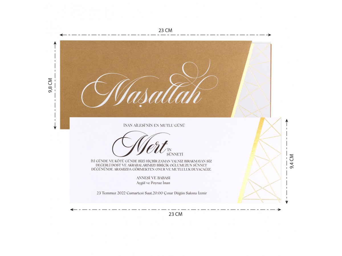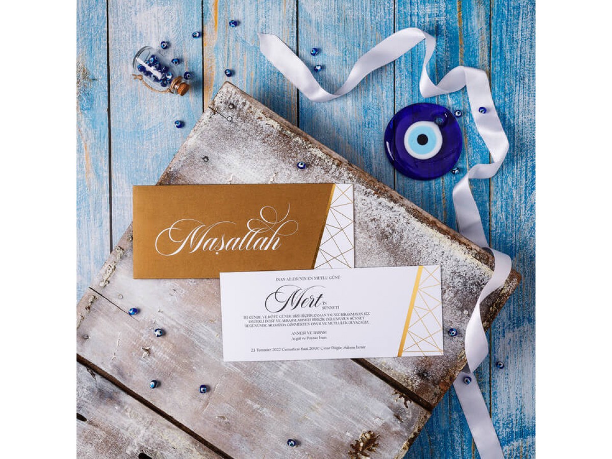Davetiyenin zarfı gold renk üzerinde maşallah yazısı vardır. İç kısmı altın yaldız işlemeli sade olarak tasarlanmıştır.