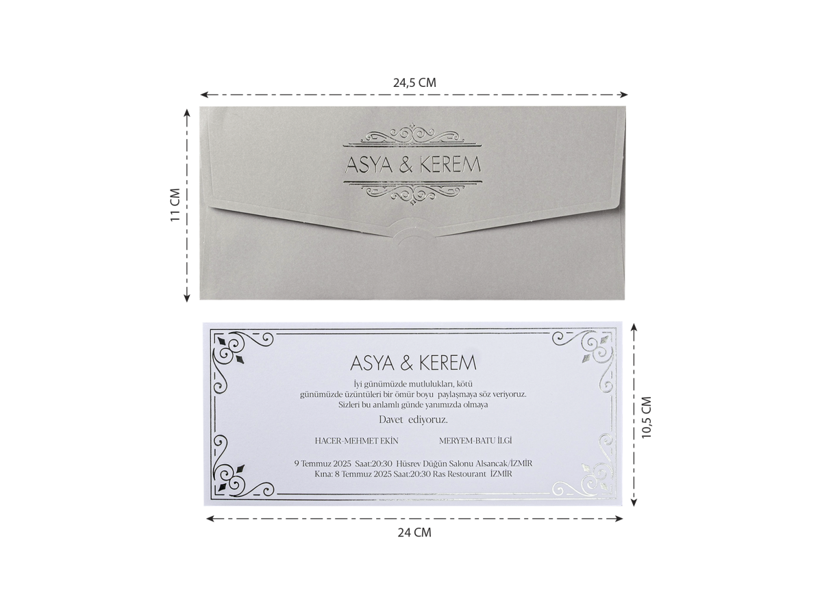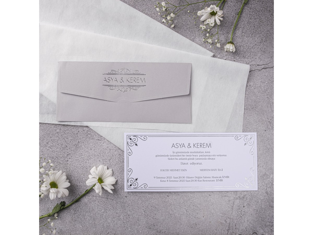 • Zarfın üzerine gelin ve damat isimleri gümüş yaldız baskı uygulanmıştır. İç kısmı gümüş yaldız çerçeveli ve ofset baskı olarak tasarlanmıştır.