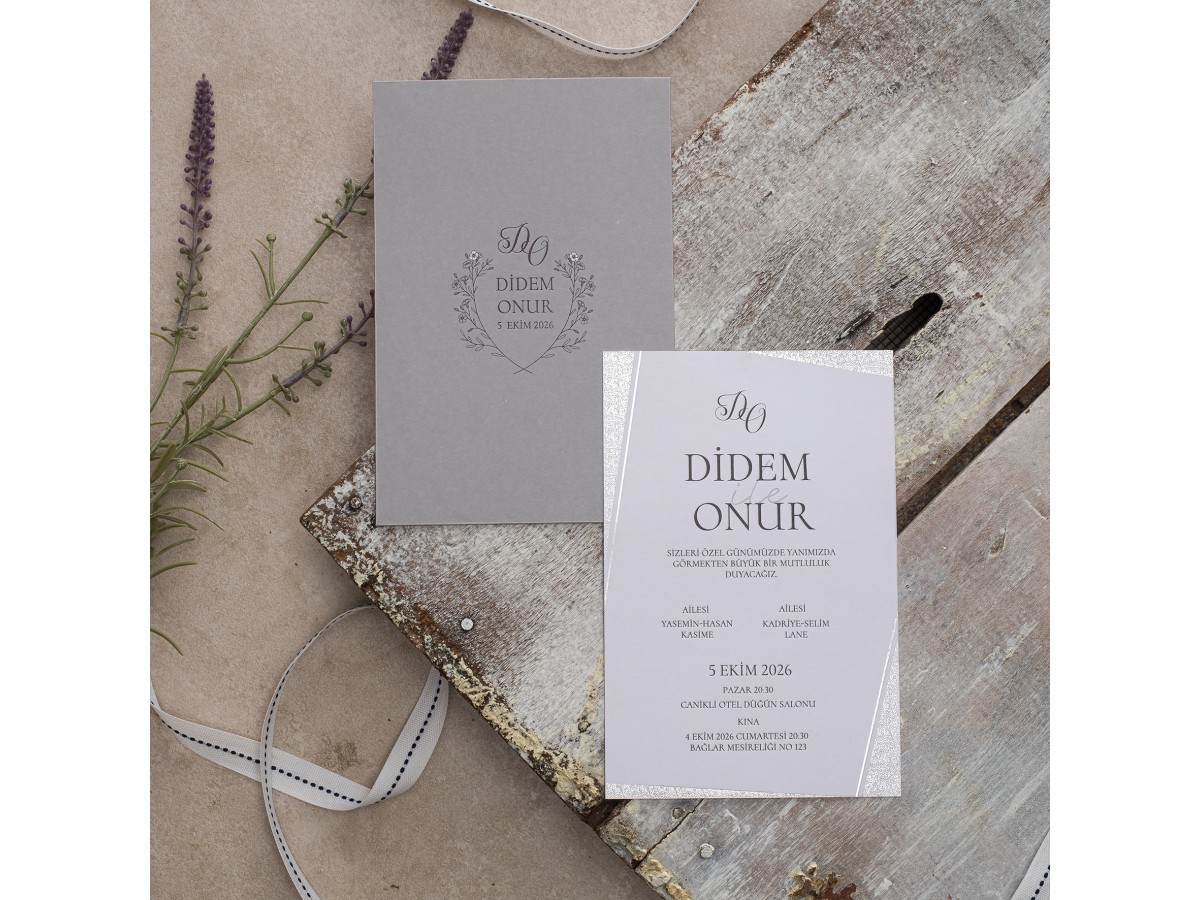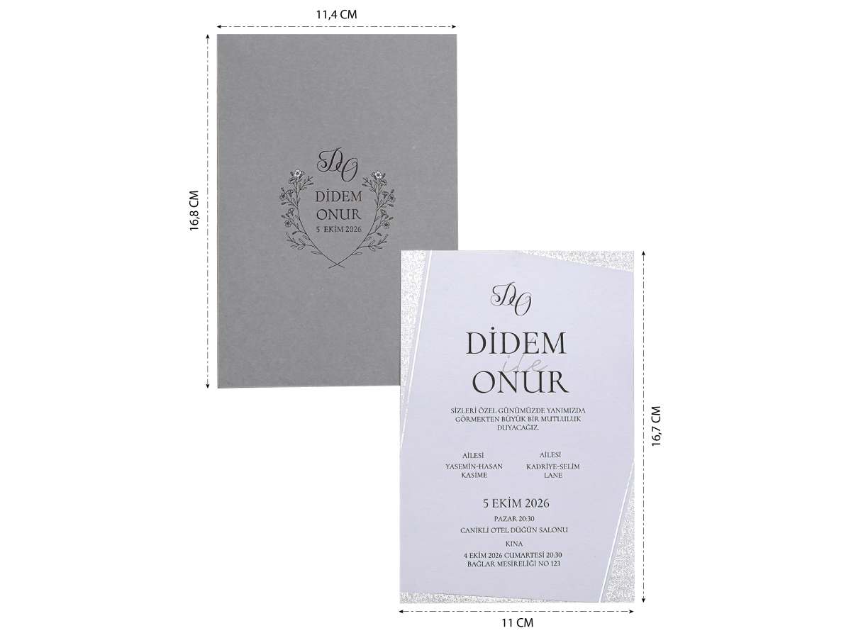 Zarfın üzerine gelin ve damat isimleri siyah yaldız baskı uygulanmıştır. İç kısmı gümüş yaldız detaylı olarak tasarlanmıştır.