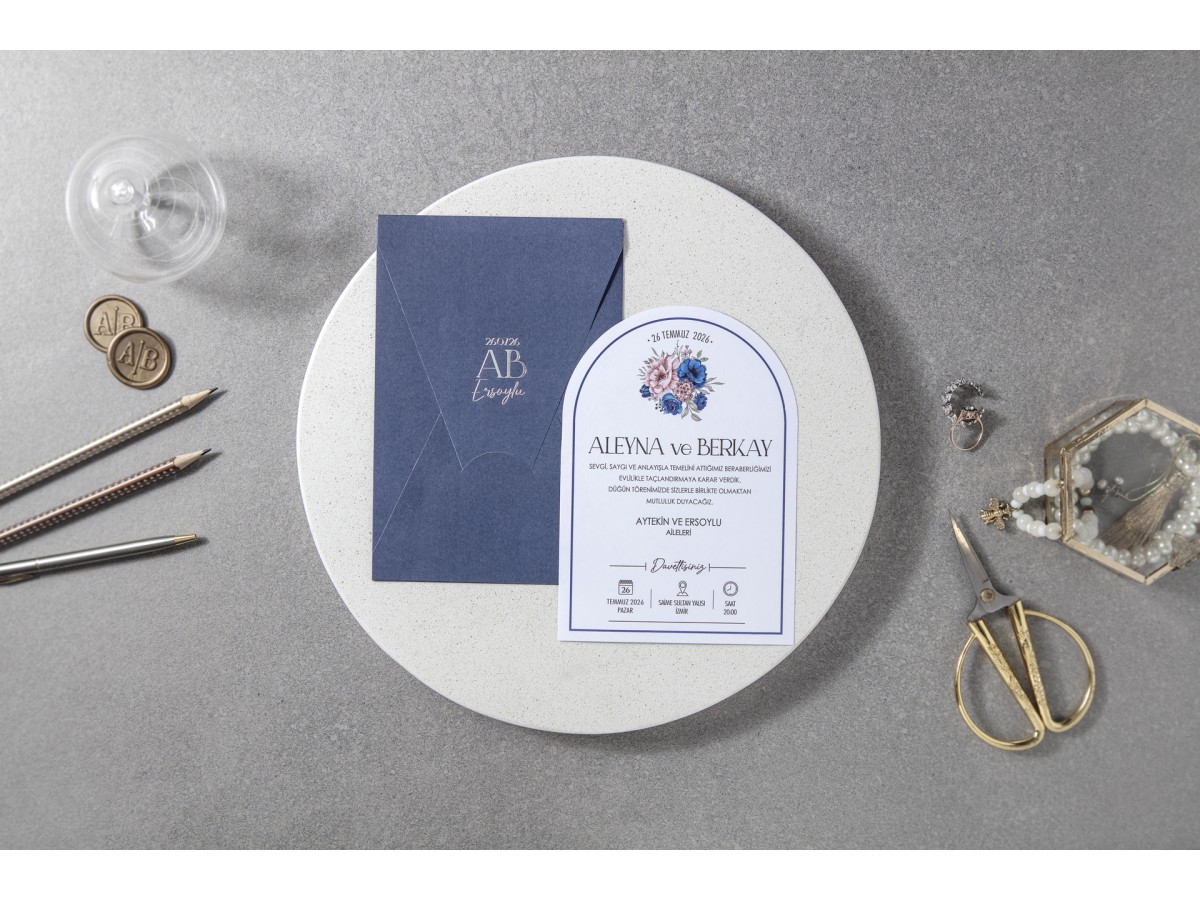 Zarfın üzerine gelin ve damat isimlerinin baş harfleri gümüş yaldız baskı uygulanmıştır. İç kısmı çiçek detaylı oval olarak tasarlanmıştır.