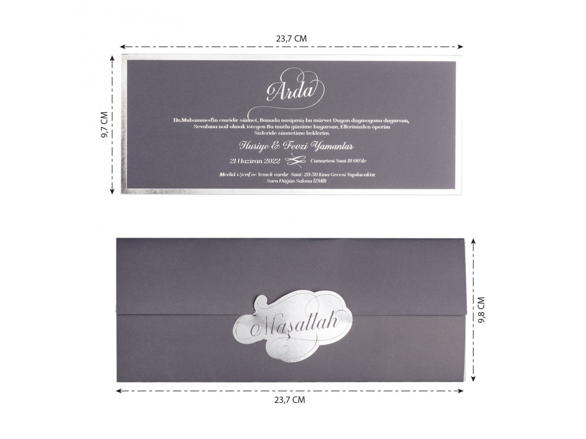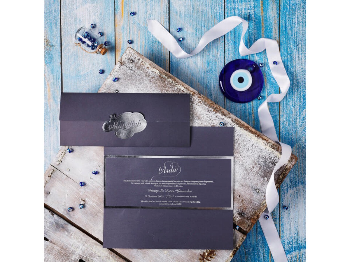Davetiyenin zarfı lacivert renk üzerinde gümüş yaldız maşallah yazısı vardır. İç kısmı lacivert renk çerçeve ve yazılar gümüş yaldız baskılıdır.