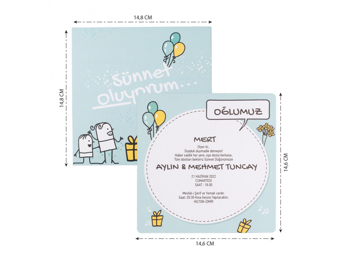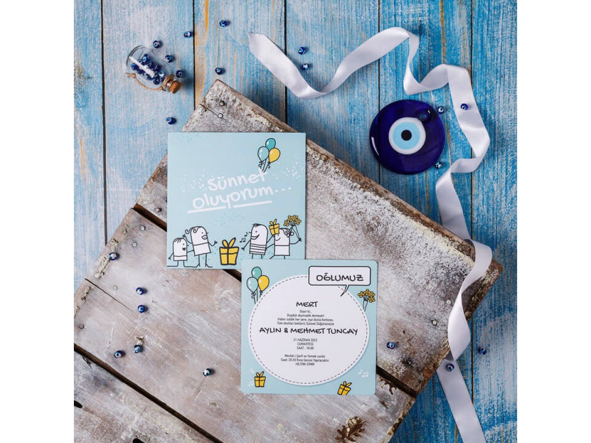 Davetiyenin zarfı açık mavi renk üzerinde karikatür ve balon detayları vardır. İç kısmı zarf ile takım olarak tasarlanmıştır.