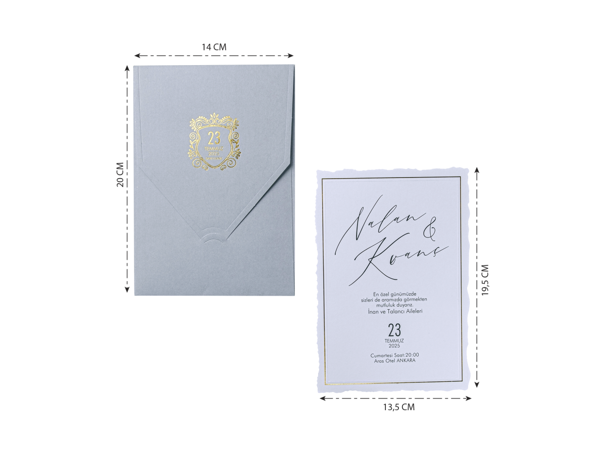 Gri renk zarf üzerinde altın yaldız baskı vardır. İç kartı ise altın yaldız çerçeve ve kenarları yırtık desen uygulanmıştır.