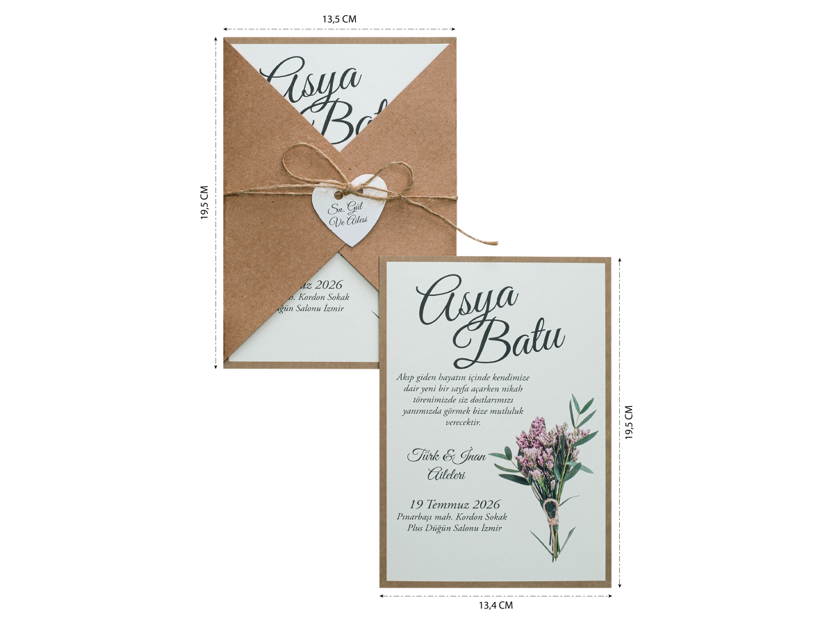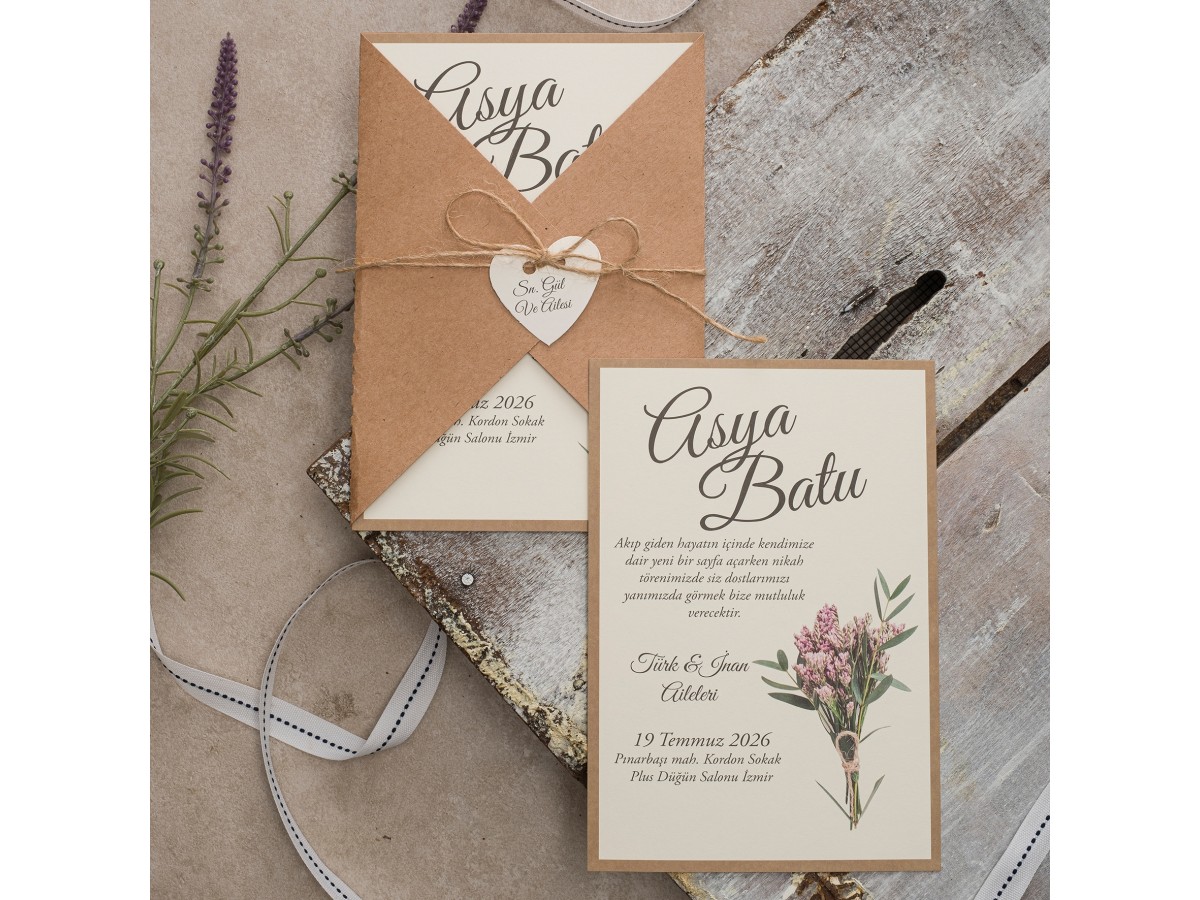Kraft zarflı isimlik ve ip aksesuarlı iç kısmı çiçek desenli şık davetiye.