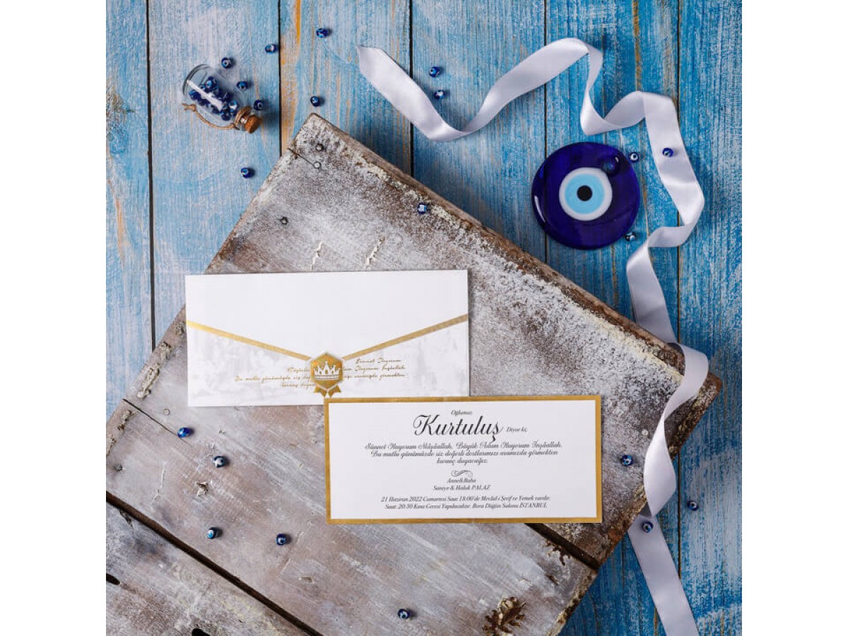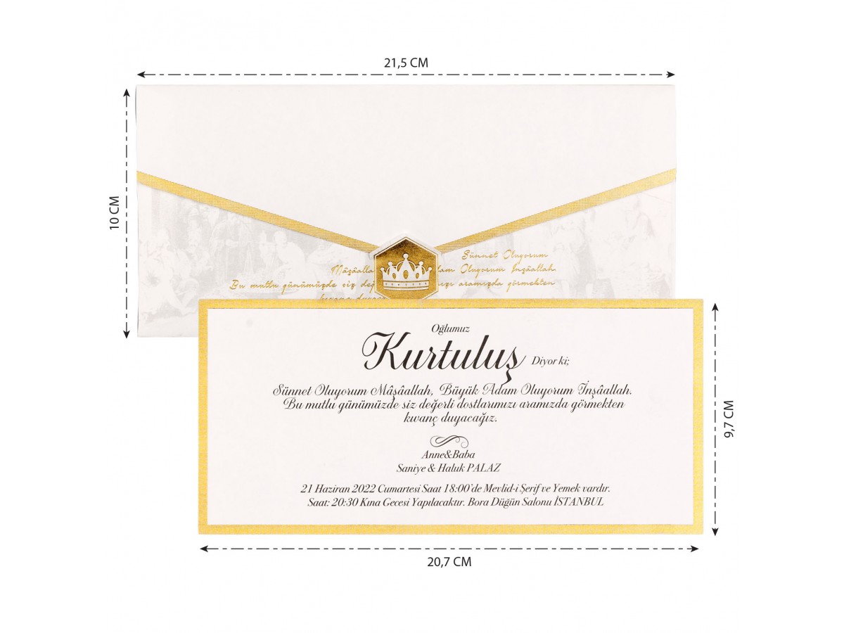 Davetiyenin zarfında altın yaldız baskılı kral tacı ve sünnet metin yazısı vardır. İç kısmı altın yaldız çerçeveli sade olarak tasarlanmıştır.