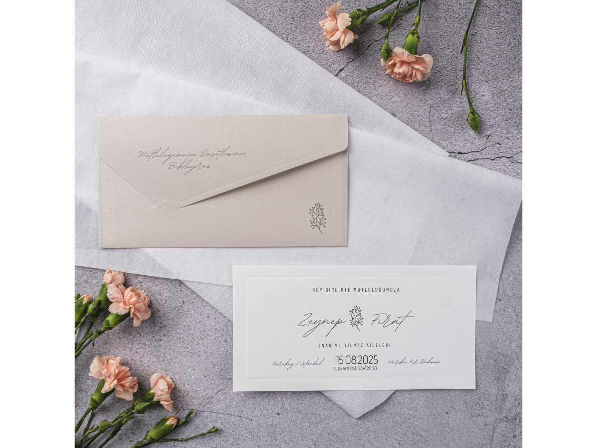 Davetiyenin ekran görüntüsü ile davetiyenin orijinali arasında renk tonlarında ufak tefek farklılıklar olabilir, bu durum hatalı olarak kabul edilmez. Kullandığınız cihazın ekran kalibrasyonu ile ilgili bir durumdur. Kağıtlardan kaynaklanan desen ve ton farklılıklarından dolayı firmamız sorumlu değildir.