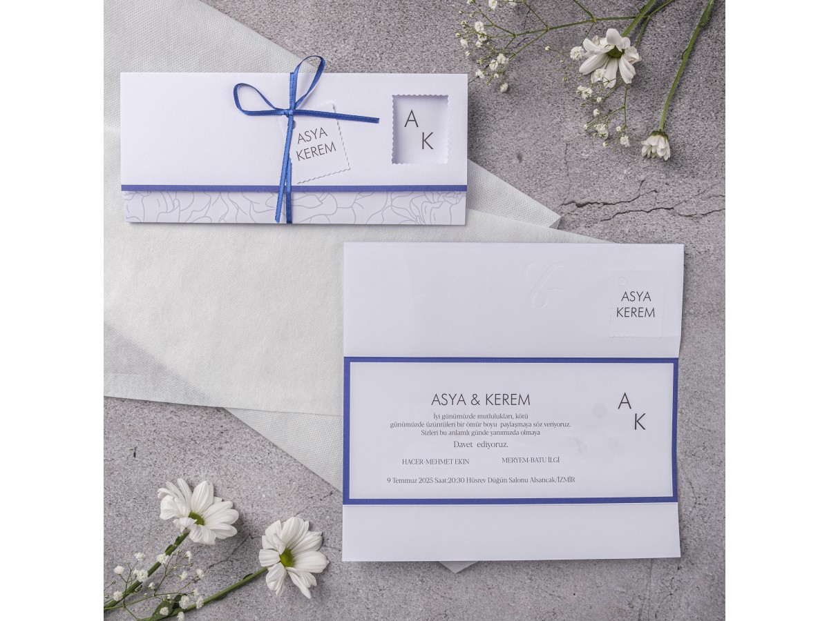 Kurdeleli ekonomik tek parça davetiye. Davetiyemizde gelin ve damat isimliği mevcuttur.