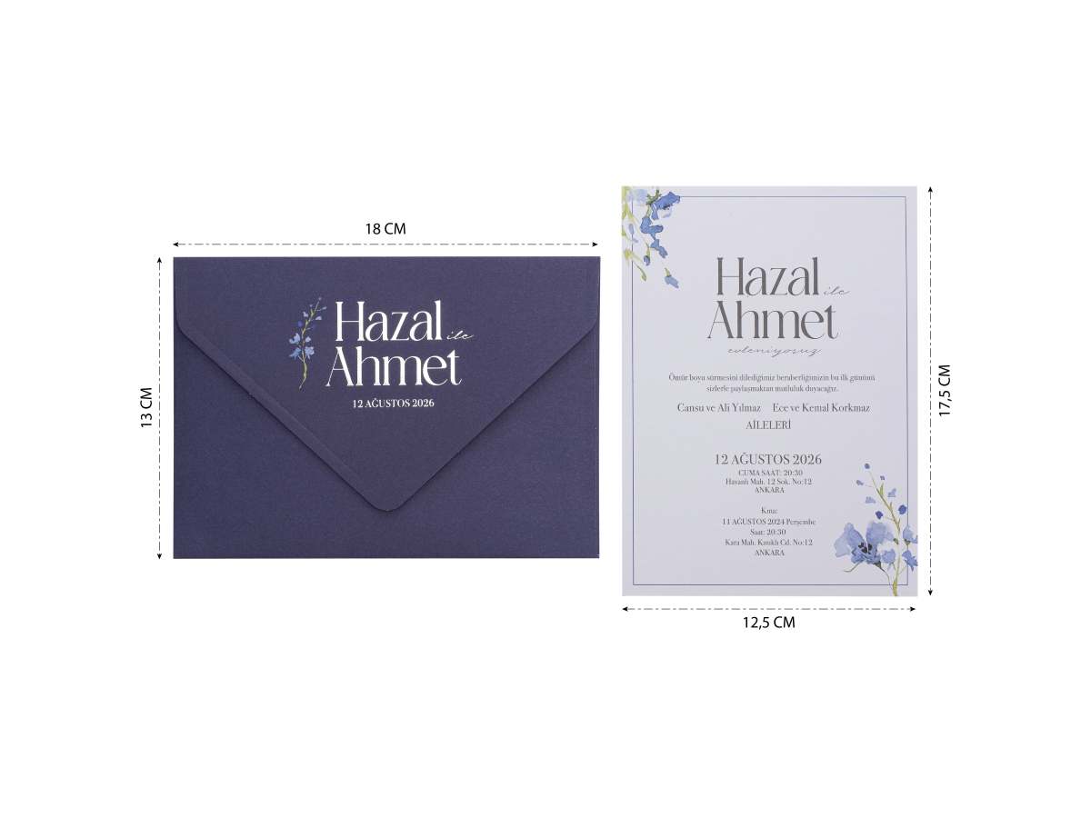 Lacivert zarfın üzerine gelin ve damat isimleri gümüş yaldız baskı uygulanmıştır. İç kısmı çiçek detaylı zarf ile takım olarak tasarlanmıştır.