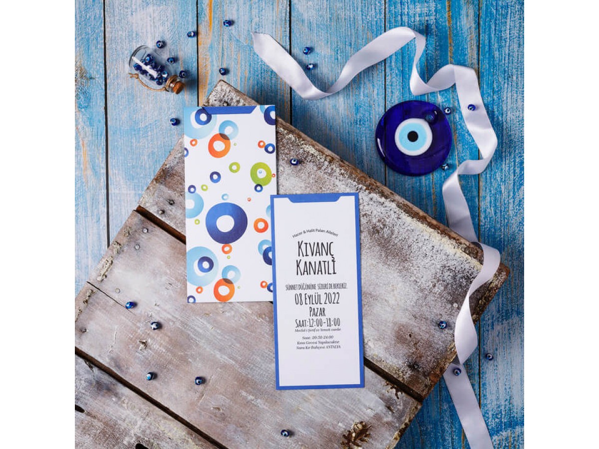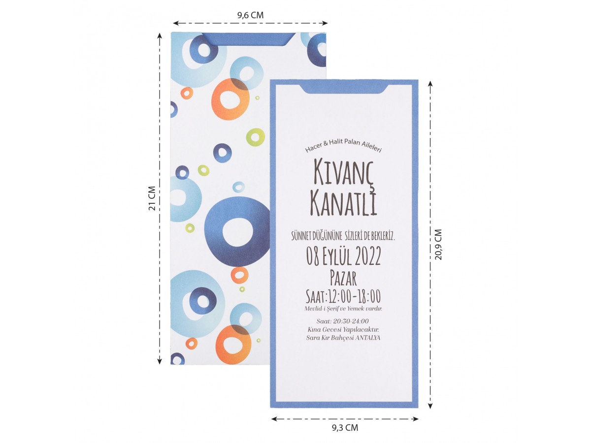 Davetiyenin zarfında renkli yuvarlak şekiller vardır. İç kısmı mavi çerçeveli sade olarak tasarlanmıştır.