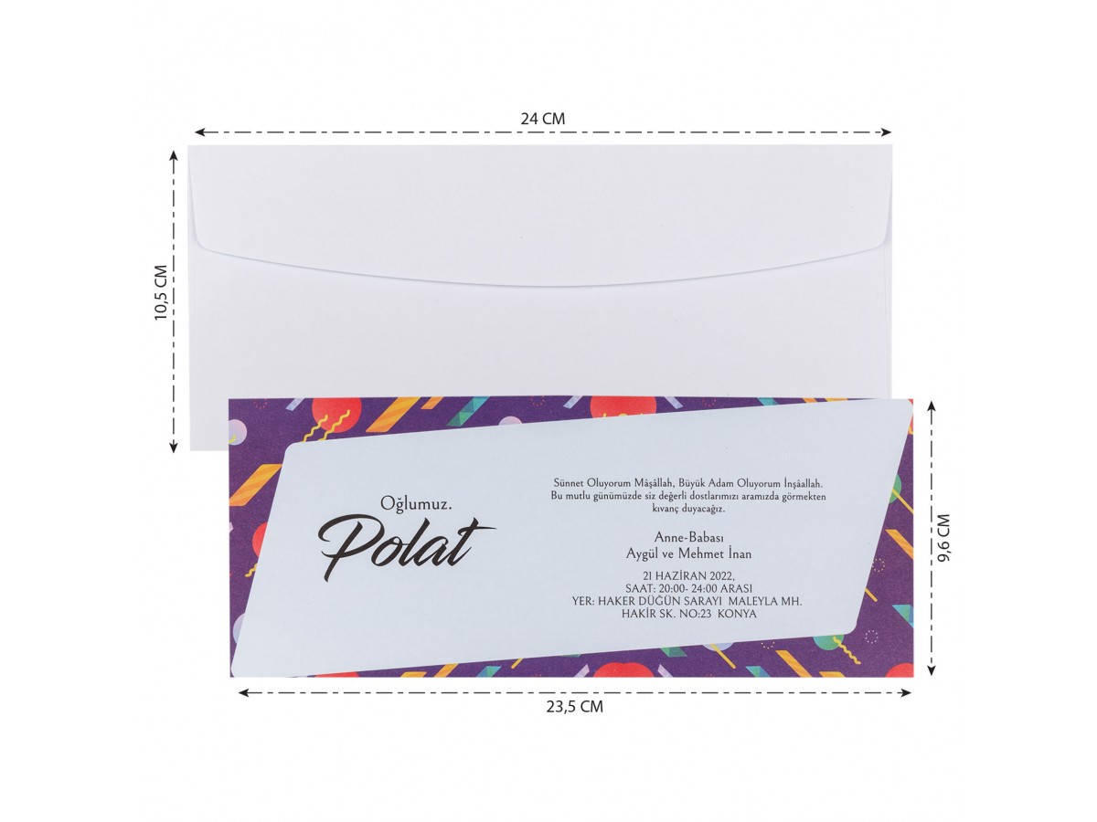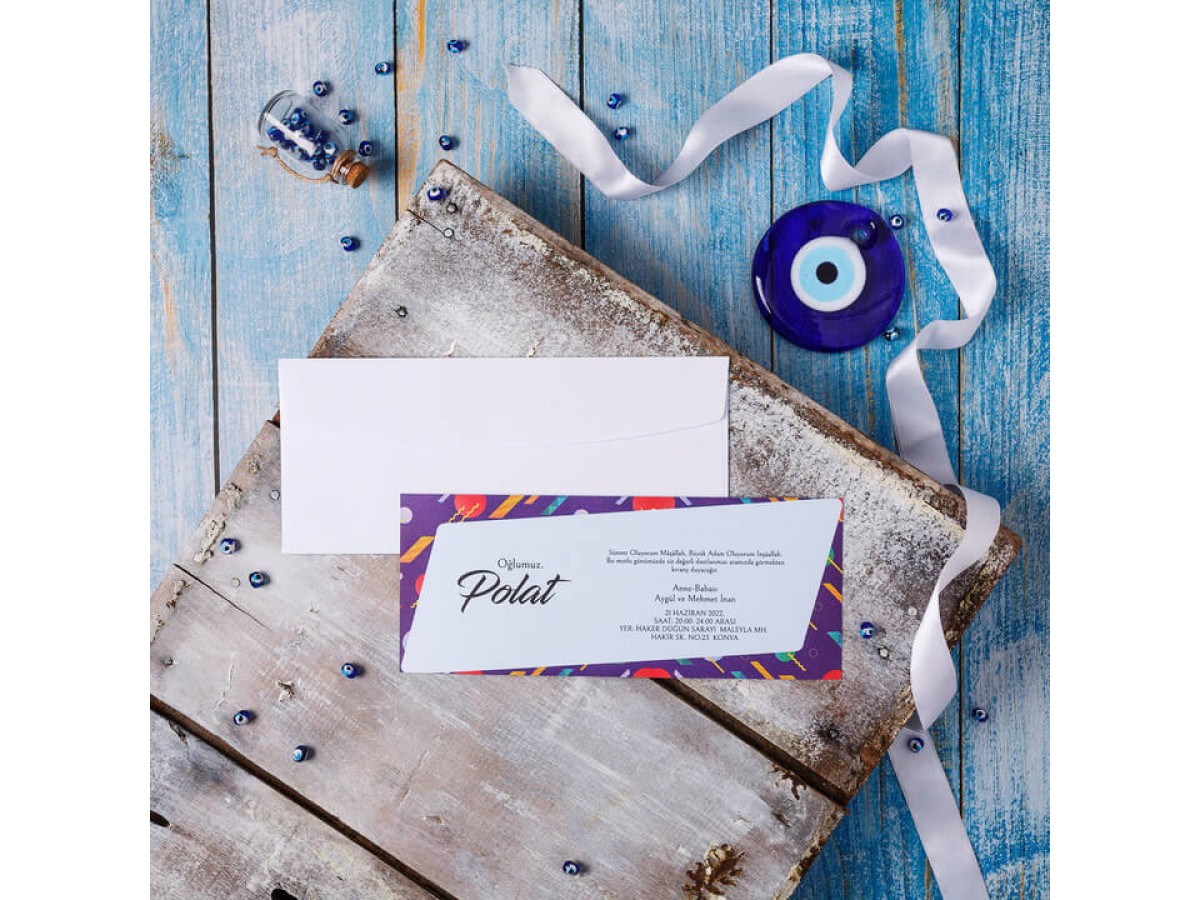 • Davetiyenin standart beyaz renk zarfı mevcuttur. İç kısmı açık mavi tonlarında renkli çerçeveli sünnet davetiyesi.