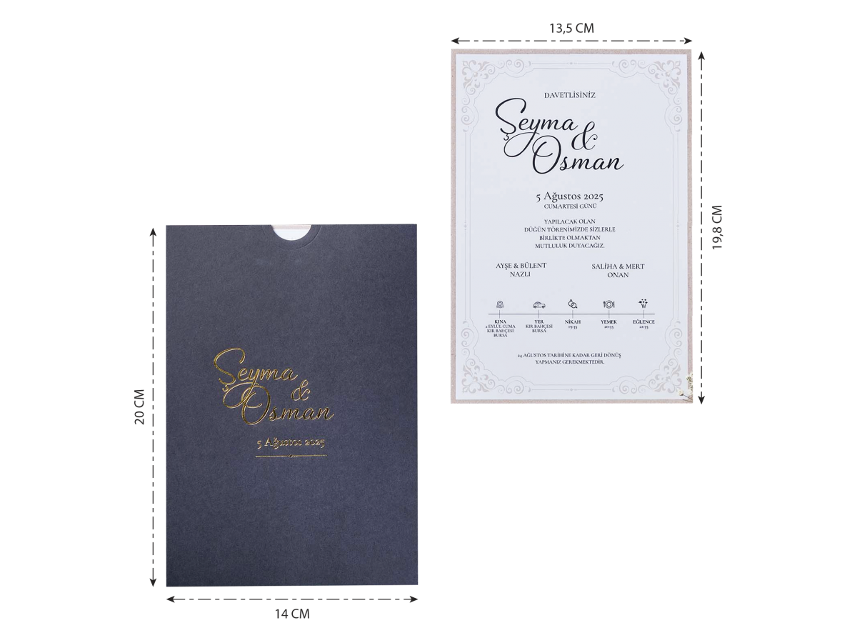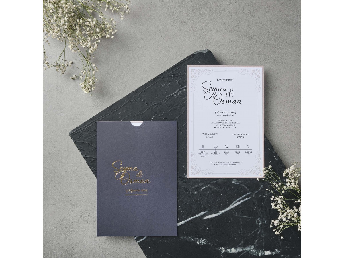 • Zarfın üzerine gelin ve damat isimleri altın yaldız baskı uygulanmıştır. İç kısmı ofset baskı monongram çerçeveli sade olarak tasarlanmıştır.