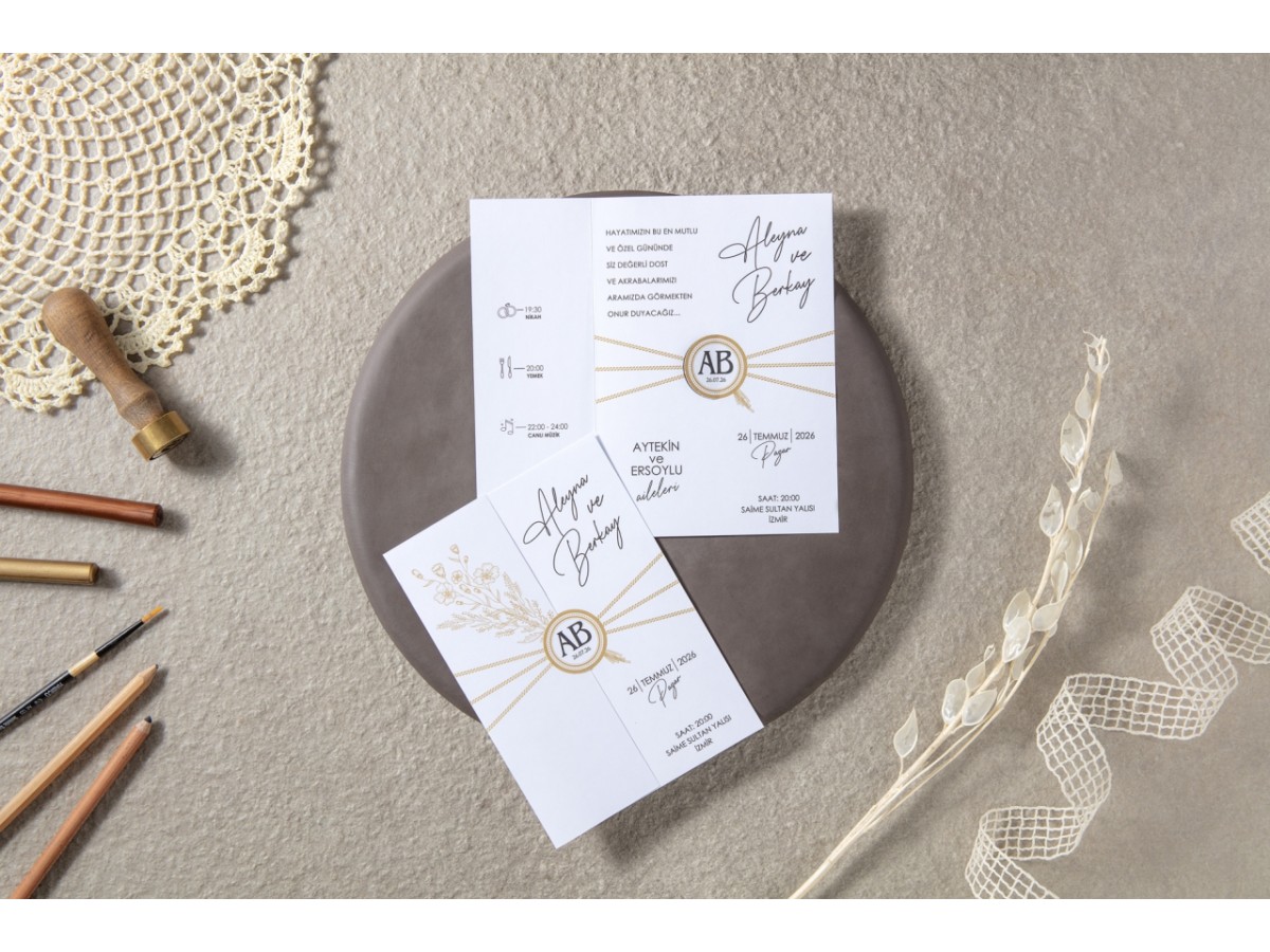 • Davetiye zarfsız olarak tasarlanmıştır. Mühür baskılı zarfsız ekonomik çiçek detaylı düğün davetiyesi.