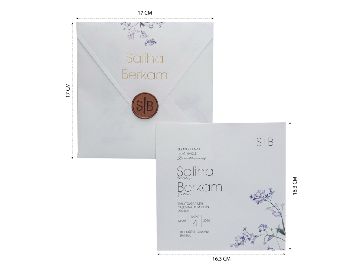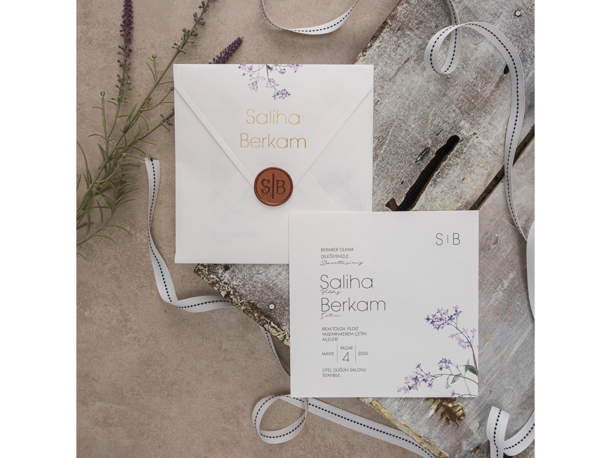 Davetiyenin zarfına gelin ve damat isimleri altın yaldız baskı uygulanmıştır. Zarf ve iç kısmı çiçekli takım olarak tasarlanmıştır. Aksesuar olarak zarfın üzerinde gelin ve damat isimlerinin baş harflerine özel mühür vardır. * Mühür ücreti fiyata dahildir.