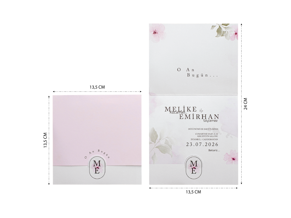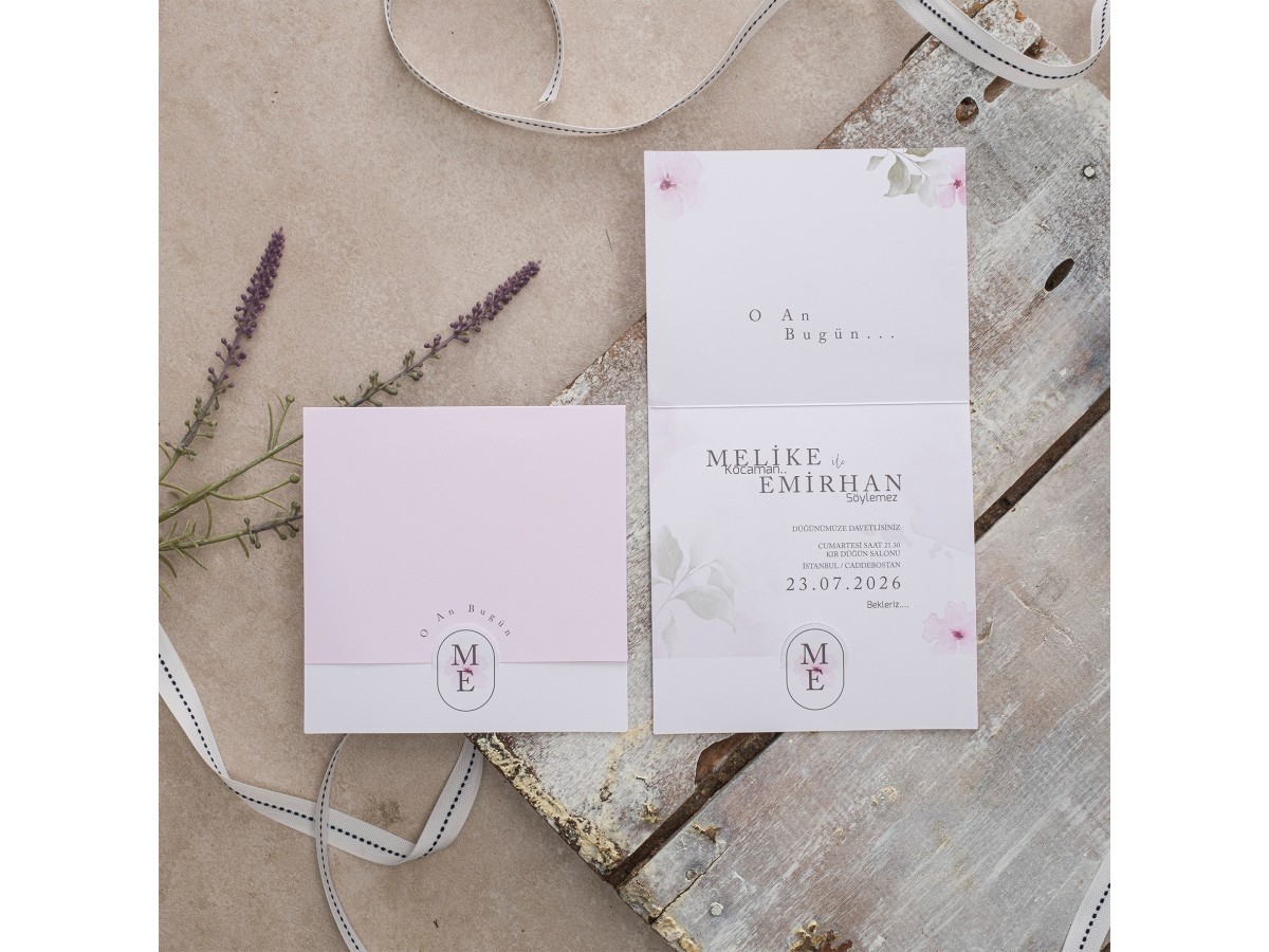 Davetiye zarfsız model tek parça olarak tasarlanmıştır. Pembe ekonomik çiçek tasarımlı zarfsız davetiye.