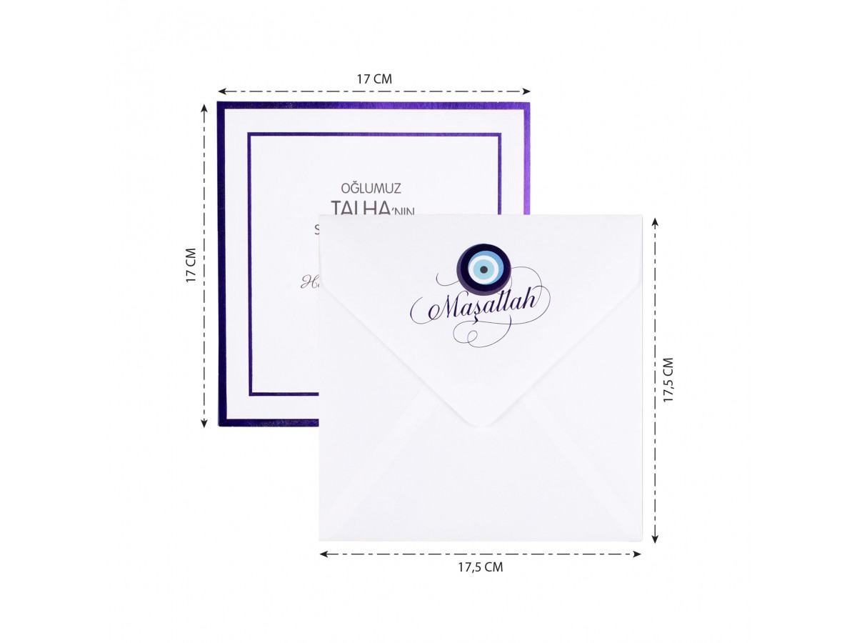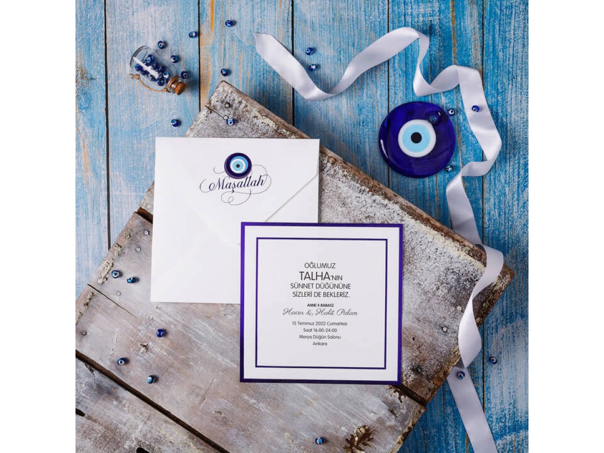 Davetiyenin zarfında nazar boncuğu baskısı vardır. İç kısmı lacivert yaldız çerçevelidir. Sünnet davetiyesi kare sade olarak tasarlanmıştır.