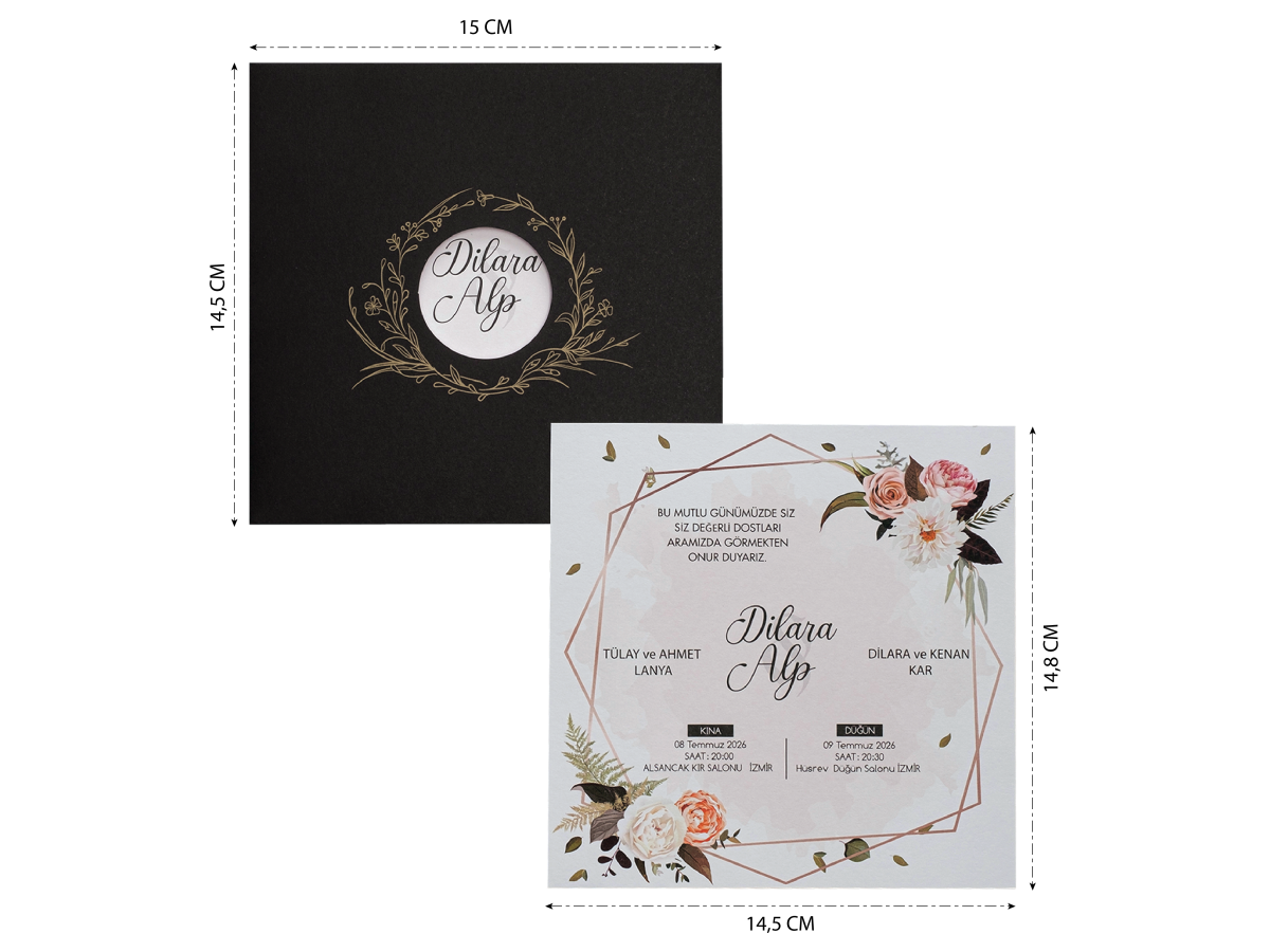 Siyah renk pencere işlemeli zarfı ve içi çiçek motifli kare davetiye.