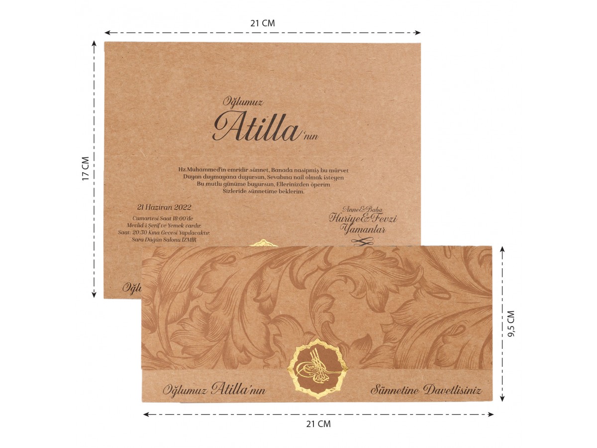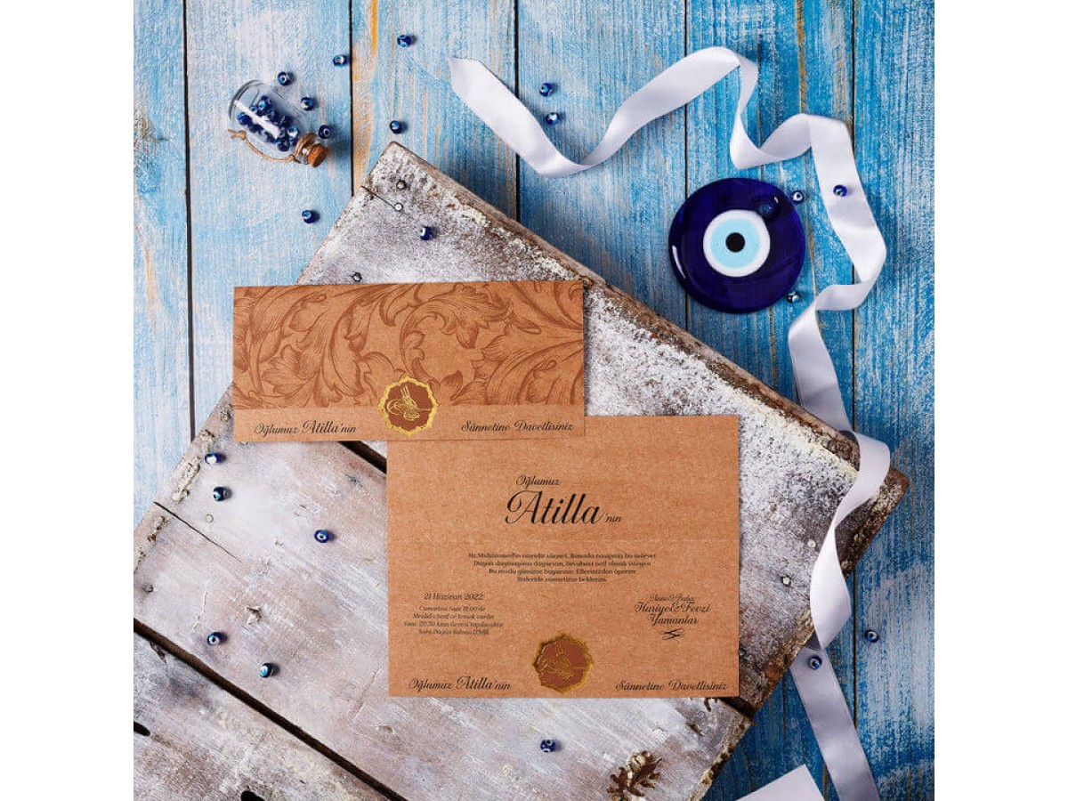 Davetiye zarfsız olarak tasarlanmıştır. Altın yaldız tuğra detaylı ekonomik kraft sünnet davetiyesi.