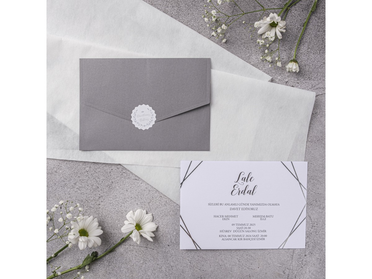 Gümüş yaldız çizgili ve gri zarflı etiketli sade davetiye.