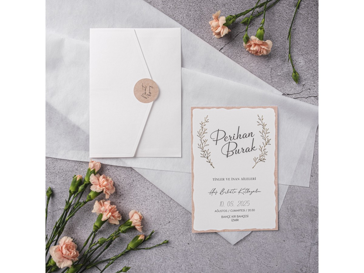 Davetiyenin ekran görüntüsü ile davetiyenin orijinali arasında renk tonlarında ufak tefek farklılıklar olabilir, bu durum hatalı olarak kabul edilmez. Kullandığınız cihazın ekran kalibrasyonu ile ilgili bir durumdur. Kağıtlardan kaynaklanan desen ve ton farklılıklarından dolayı firmamız sorumlu değildir.