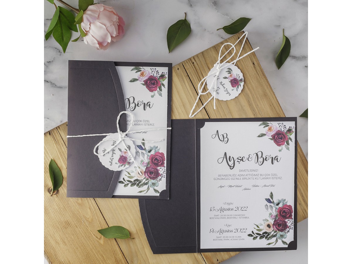 Siyah zarflı isimlik ve ip aksesuarlı çiçek desenli düğün davetiyesi.
