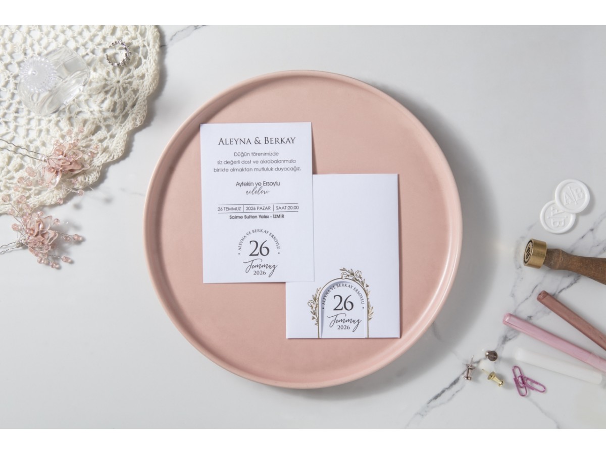 Davetiyenin altın yaldız monogram detaylı arkadan kilitli zarfı vardır. İç kısmı sade olarak tasarlanmıştır.