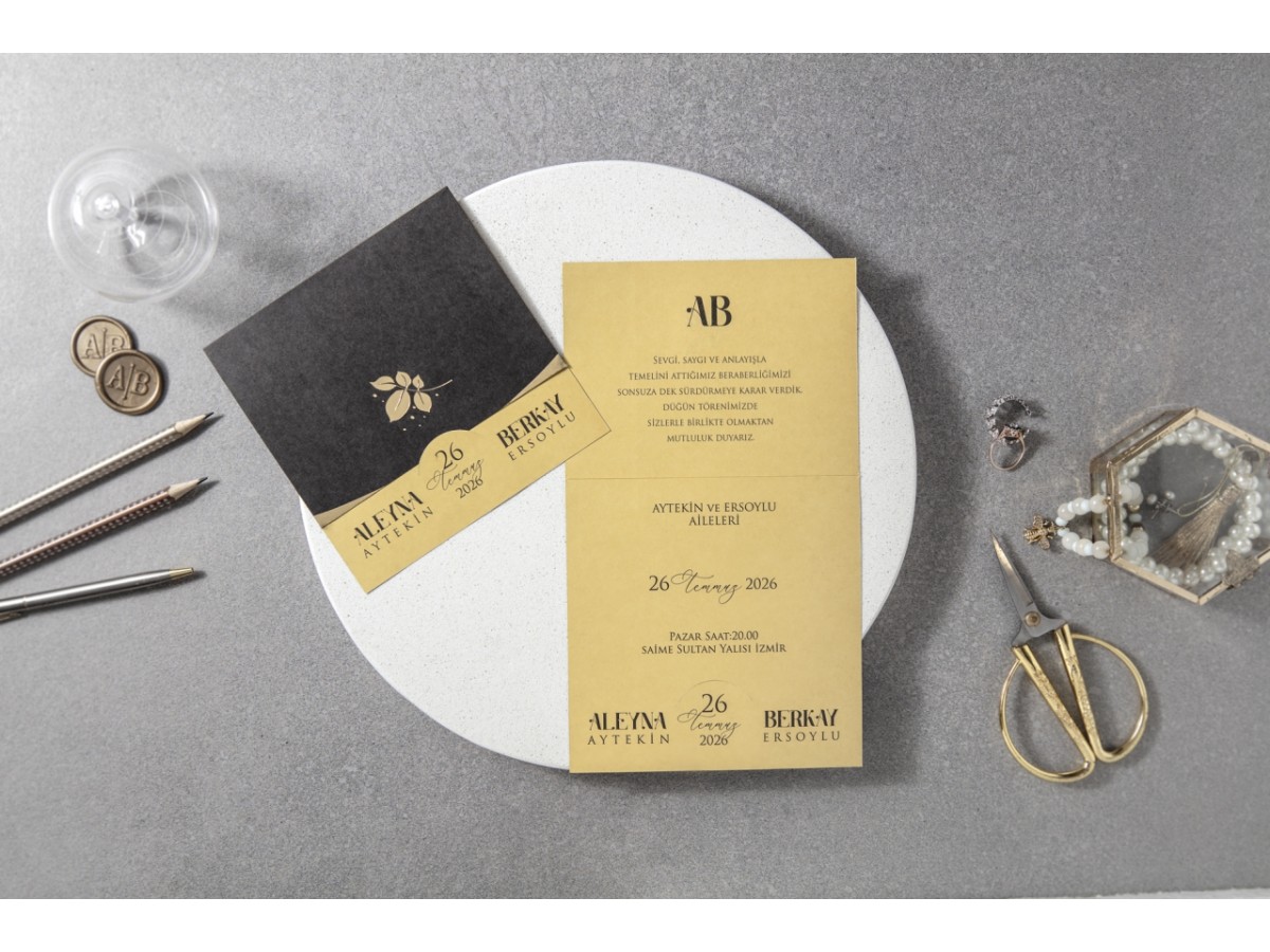 Davetiye zarfsız olarak tasarlanmıştır. Altın yaldız çiçek monogram detaylı zarfsız ekonomik düğün davetiyesi.